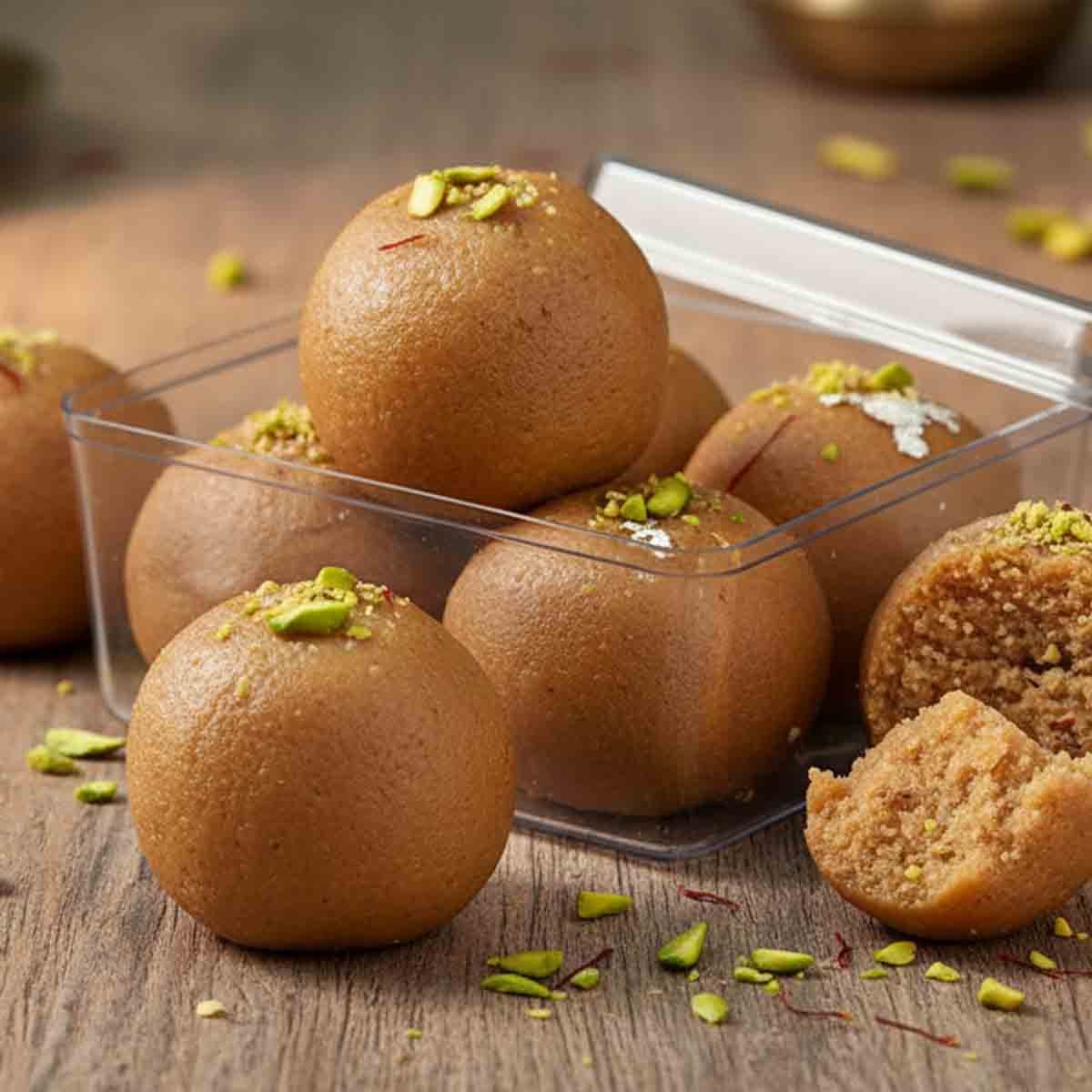Gram Flour, Desi Ghee, Almond, Cashew, Pistachio Toppings, Raisin, Edible Gum, Fox Nut (Makhana), Sugar