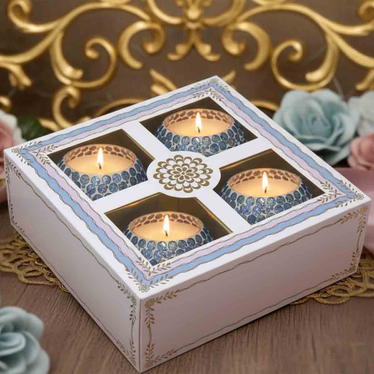 This decorative candle hamper features four intricately designed mosaic tealight candles, arranged for maximum visual appeal.