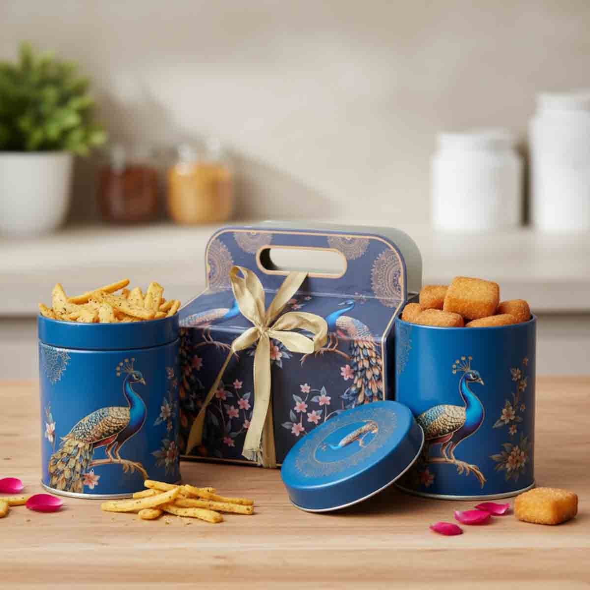 This premium tin jar features intricate peacock and floral motifs, making it a visually striking gifting option.