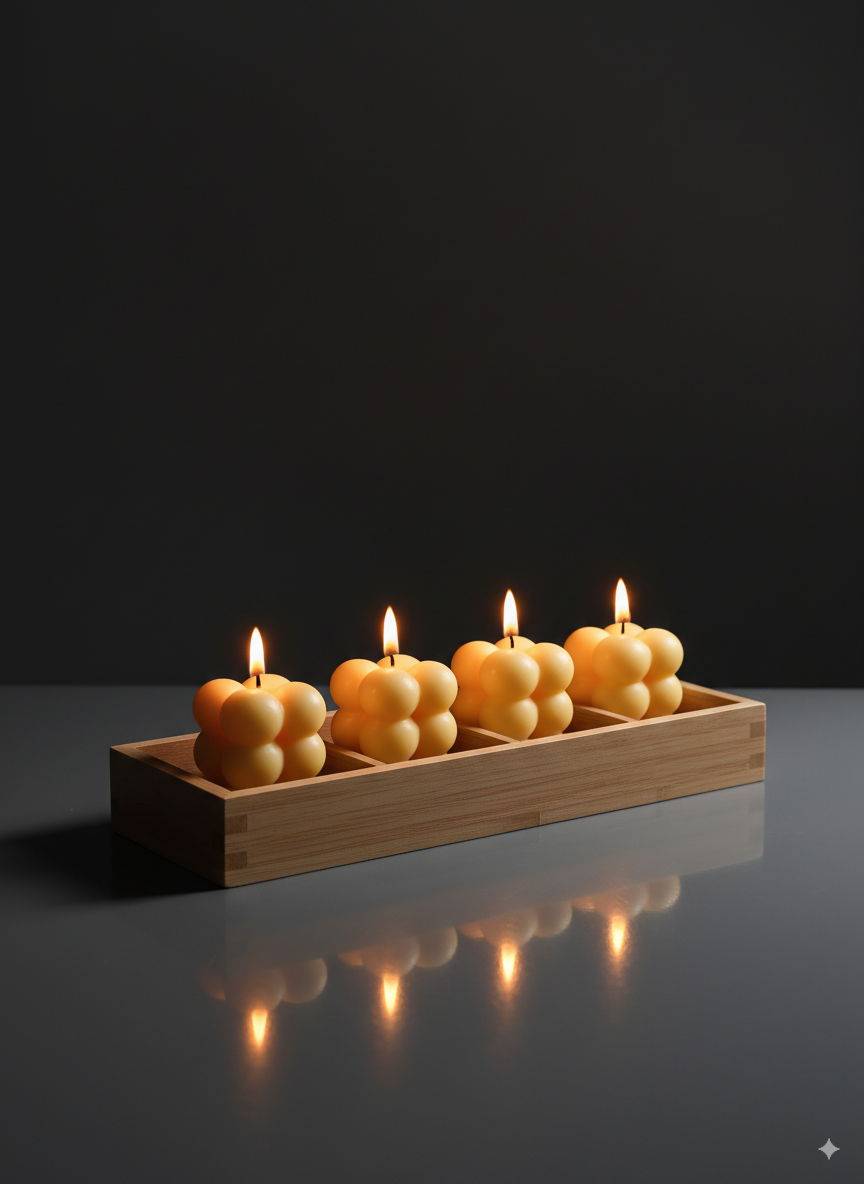 Bring playful elegance and fragrant warmth to your space with this set of six handcrafted bubble candles, beautifully arranged in a stylish box. Each candle is uniquely coloured and scented to offer a delightful sensory experience: orange with inviting vanilla, blue with refreshing lemongrass, yellow with soothing sandalwood, green with spicy cinnamon, pink with earthy petrichor, and white with tranquil white musk. Artfully molded and hand-poured from premium soy wax, these candles deliver a clean, enduring glow and captivating aroma. Their modern geometric design and harmonious blend of colours and fragrances make them ideal for gifting, special occasions, or elevating everyday décor with a touch of sophistication and charm. Dimensions: 3*3*3 cm.Net wax weight per candle:33 grams.Product Code C13.#Candles in Box=6.Shipping charges extra, if applicable.